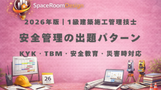施工管理法(安全管理③) 【2026年版】一級建築施工管理技士|安全管理はここだけ覚えろ(KYK・TBM・安全教育・災害時対応)【過去10年の出題パターン分析】 【2026年版】一級建築施工管理技士 一次検定の安全管理対策。過去10年分析から、KYK(4ラウンド法)・TBM・安全教育・災害時対応の重要ポイントを整理。救助→応急→報告、休業4日以上・1〜3日ルール、法令ベースの対象と手順を解説。 2026.04.07 施工管理法(安全管理③)